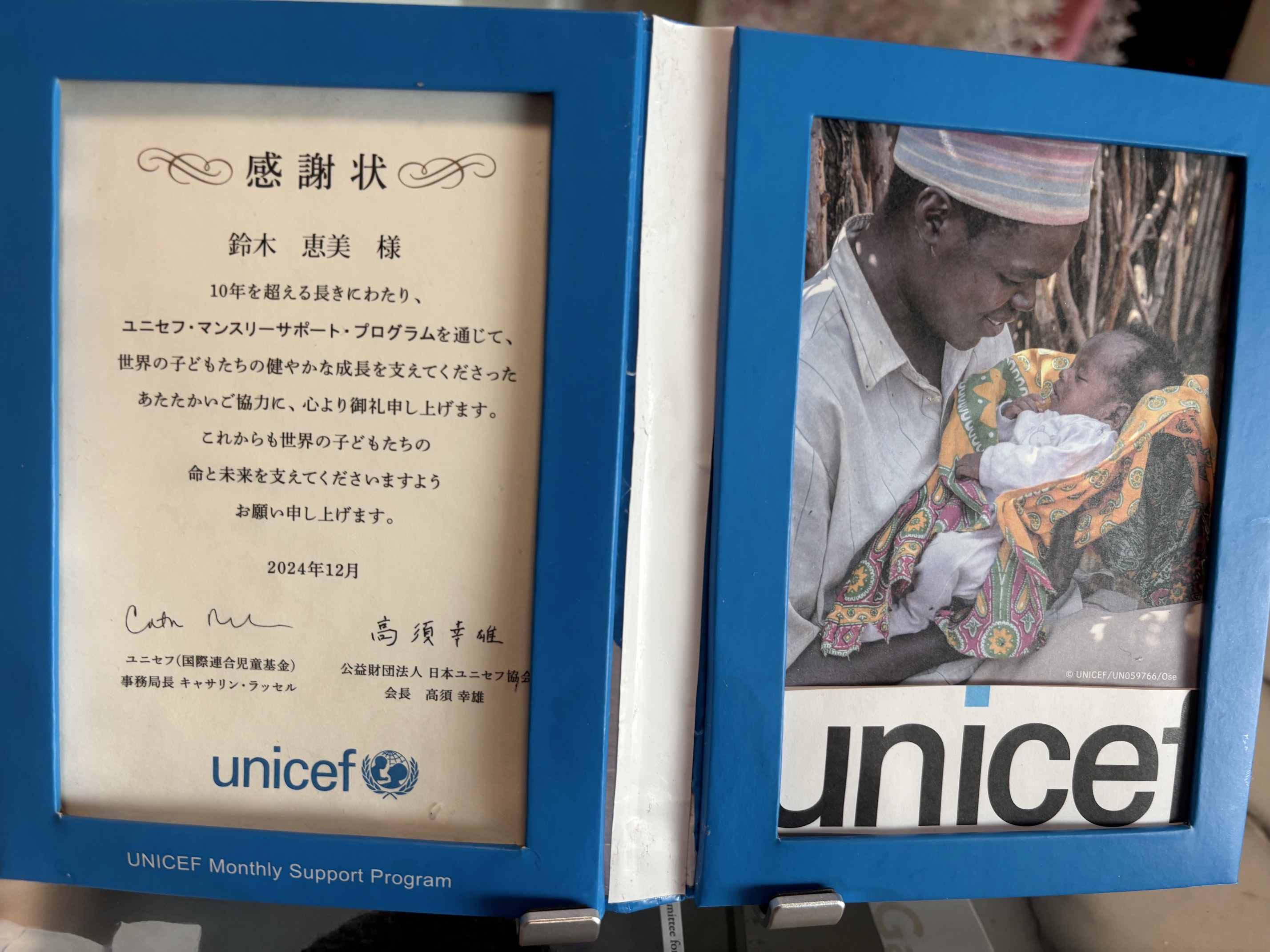 ユニセフよりこれまでの活動に対する感謝状を頂戴いたしました。