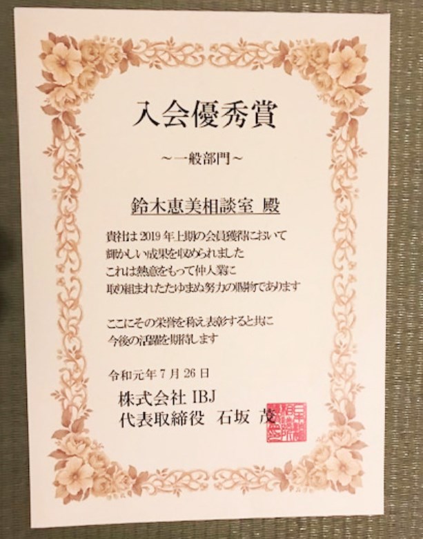 東北・仙台・東京の結婚相談所の婚活カウンセラー鈴木でございます。 日本結婚相談所連盟 IBJから、2019年上半期の成績の優秀賞を頂きました。 仲人は好きな仕事で、社会貢献もでき、私の天職だと思っております。 色々な方達と交流が持て、社会勉強にな... -